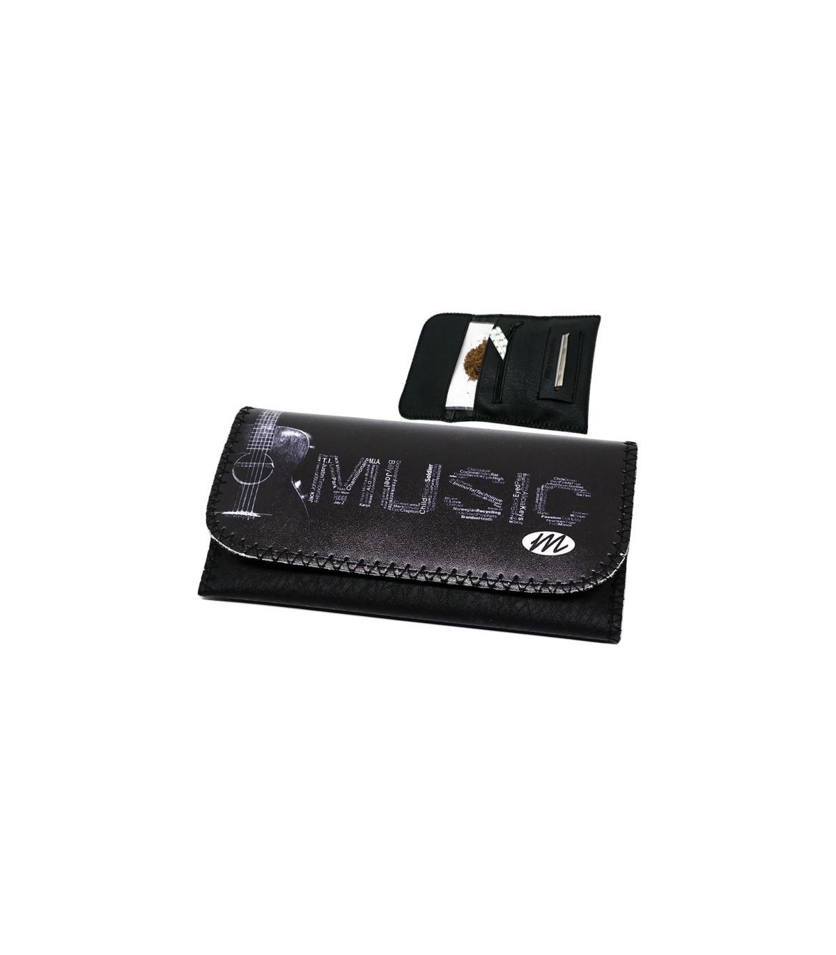 Η καπνοθήκη MONTE 0101 GUITAR MUSIC ROXY έχει σχέδιο μια κιθάρα, έχει μεγάλο μέγεθος, έχει χρώμα μαύρο, διπλώνει στα τρία και είναι κατασκευασμένη από τεχνόδερμα PU (Leather). Μπορεί να δεχτεί σακουλάκι καπνού μέχρι 30gr ή χύμα καπνό και διαθέτει θέσεις για χαρτάκια φιλτράκια. Κλείνει με τέσσερις εσωτερικούς μαγνήτες.