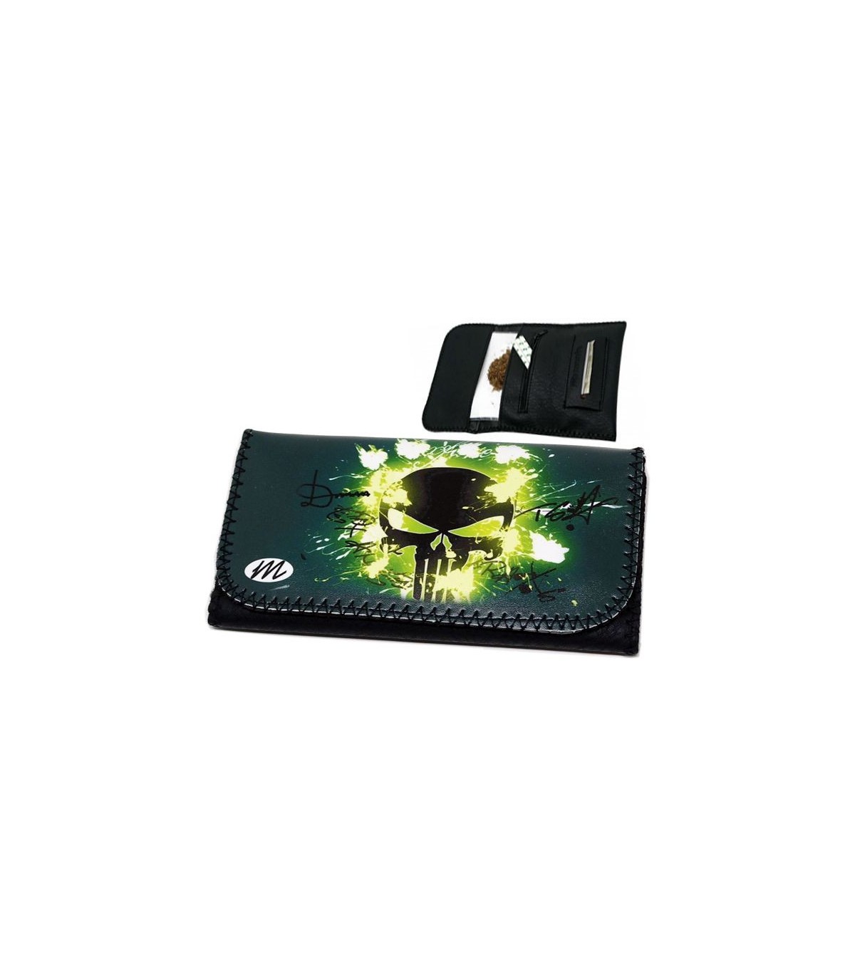 Η καπνοθήκη MONTE 0144 GREEN SKULL ROXY έχει σχέδιο ένα κρανίο, έχει μεγάλο μέγεθος, διπλώνει στα τρία και είναι κατασκευασμένη από τεχνόδερμα PU (Leather). Μπορεί να δεχτεί σακουλάκι καπνού μέχρι 30gr ή χύμα καπνό και διαθέτει θέσεις για χαρτάκια φιλτράκια. Κλείνει με τέσσερις εσωτερικούς μαγνήτες.