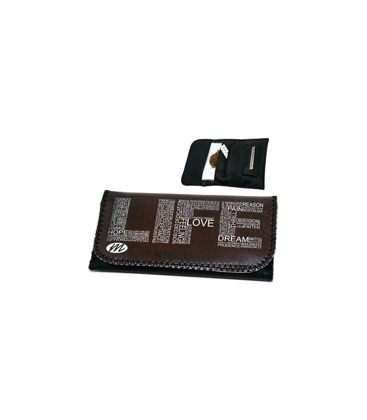 Η καπνοθήκη MONTE 0148 LIFE ROXY έχει σχέδιο το Logo LIFE, έχει μεγάλο μέγεθος, διπλώνει στα τρία και είναι κατασκευασμένη από τεχνόδερμα PU (Leather). Μπορεί να δεχτεί σακουλάκι καπνού μέχρι 30gr ή χύμα καπνό και διαθέτει θέσεις για χαρτάκια φιλτράκια. Κλείνει με τέσσερις εσωτερικούς μαγνήτες.