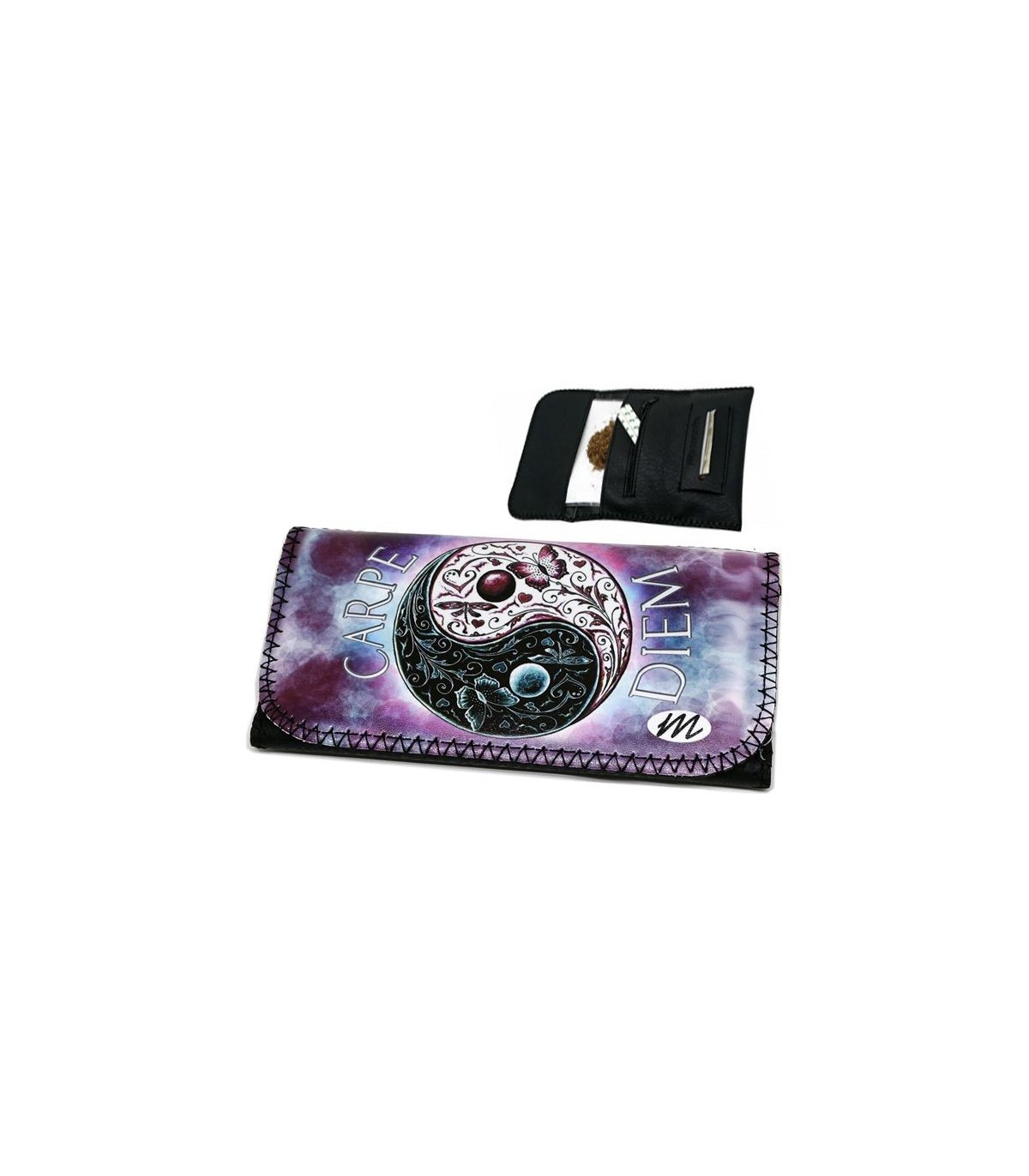Η καπνοθήκη MONTE 0143 CARPE DIEM ROXY έχει σχέδιο το ΓΙΝ ΓΙΑΝΓΚ CARPE DIEM, έχει μεγάλο μέγεθος, διπλώνει στα τρία και είναι κατασκευασμένη από τεχνόδερμα PU (Leather). Μπορεί να δεχτεί σακουλάκι καπνού μέχρι 30gr ή χύμα καπνό και διαθέτει θέσεις για χαρτάκια φιλτράκια. Κλείνει με τέσσερις εσωτερικούς μαγνήτες.
