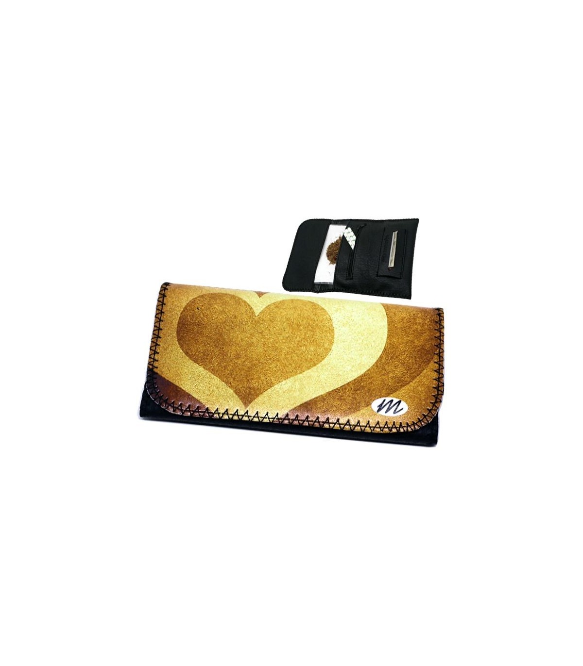 Η καπνοθήκη MONTE 0157 GOLDEN HEART έχει μεγάλο μέγεθος, διπλώνει στα τρία και είναι κατασκευασμένη από τεχνόδερμα PU (Leather). Μπορεί να δεχτεί σακουλάκι καπνού μέχρι 30gr ή χύμα καπνό και διαθέτει θέσεις για χαρτάκια φιλτράκια. Κλείνει με τέσσερις εσωτερικούς μαγνήτες.