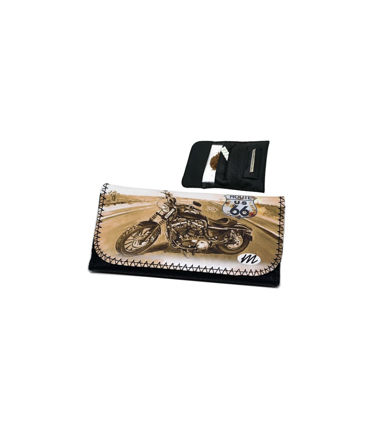 Η καπνοθήκη MONTE 0178 ROUTE 66 απεικονίζει μια Harley Davidson, έχει μεγάλο μέγεθος, διπλώνει στα τρία και είναι κατασκευασμένη από τεχνόδερμα PU (Leather). Μπορεί να δεχτεί σακουλάκι καπνού μέχρι 30gr ή χύμα καπνό και διαθέτει θέσεις για χαρτάκια φιλτράκια. Κλείνει με τέσσερις εσωτερικούς μαγνήτες.