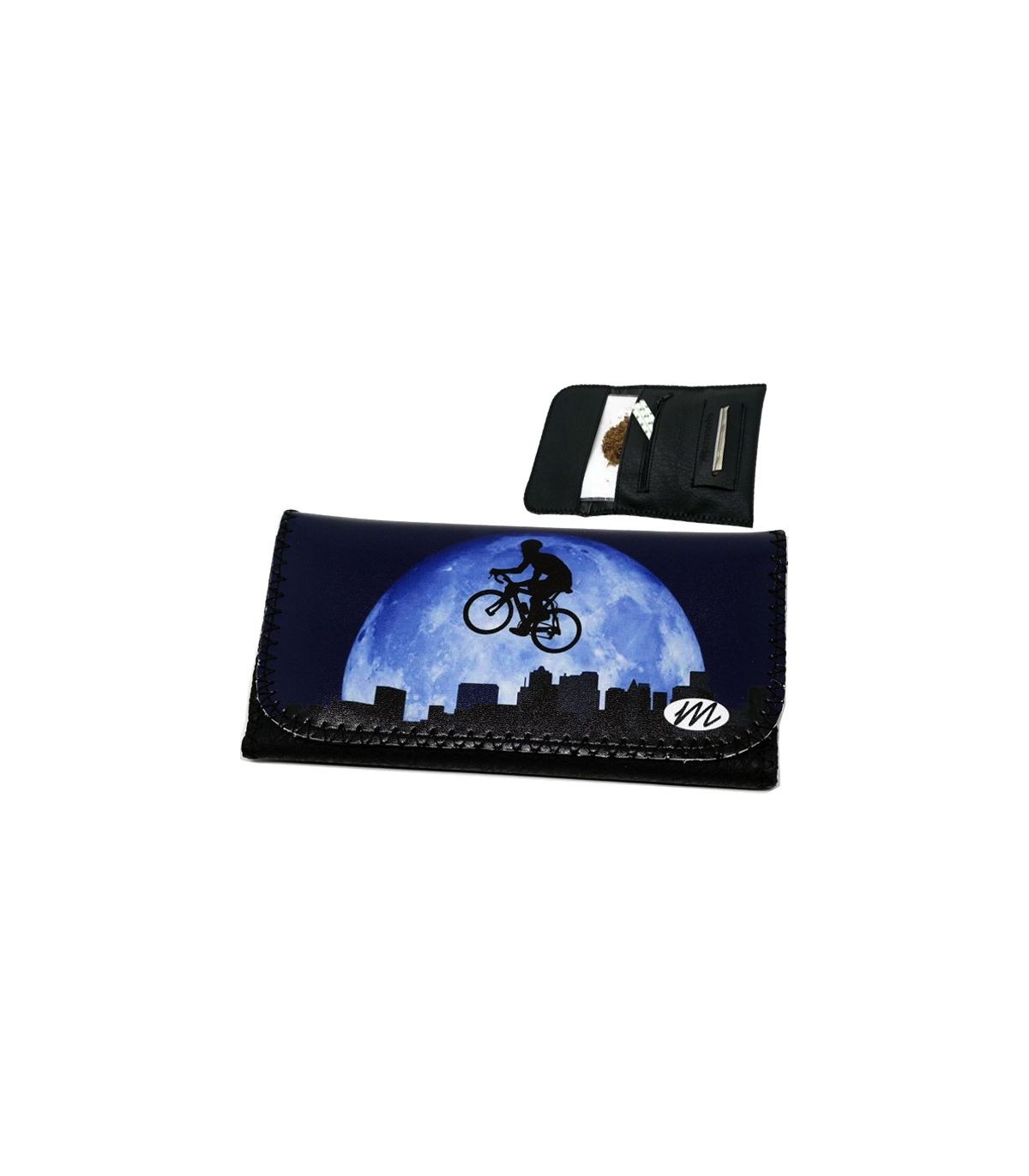 Η καπνοθήκη MONTE 0171 BIKE ON THE MOON έχει μεγάλο μέγεθος, διπλώνει στα τρία και είναι κατασκευασμένη από τεχνόδερμα PU (Leather). Μπορεί να δεχτεί σακουλάκι καπνού μέχρι 30gr ή χύμα καπνό και διαθέτει θέσεις για χαρτάκια φιλτράκια. Κλείνει με τέσσερις εσωτερικούς μαγνήτες.