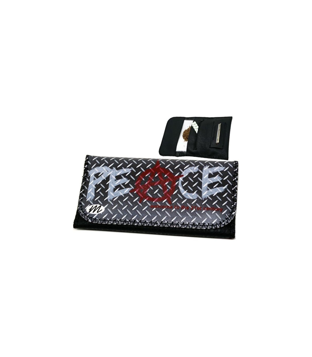 Η καπνοθήκη MONTE 0170 PEACE WELCOME TO THE 21ST CENTURY έχει μεγάλο μέγεθος, διπλώνει στα τρία και είναι κατασκευασμένη από τεχνόδερμα PU (Leather). Μπορεί να δεχτεί σακουλάκι καπνού μέχρι 30gr ή χύμα καπνό και διαθέτει θέσεις για χαρτάκια φιλτράκια. Κλείνει με τέσσερις εσωτερικούς μαγνήτες.