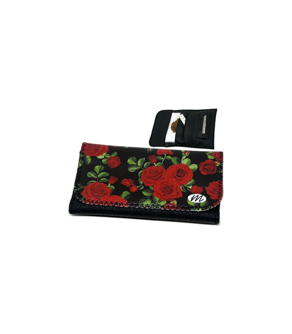 Η καπνοθήκη MONTE 0181 ROSES IN TO THE DARK έχει μεγάλο μέγεθος, διπλώνει στα τρία και είναι κατασκευασμένη από τεχνόδερμα PU (Leather). Μπορεί να δεχτεί σακουλάκι καπνού μέχρι 30gr ή χύμα καπνό και διαθέτει θέσεις για χαρτάκια φιλτράκια. Κλείνει με τέσσερις εσωτερικούς μαγνήτες.