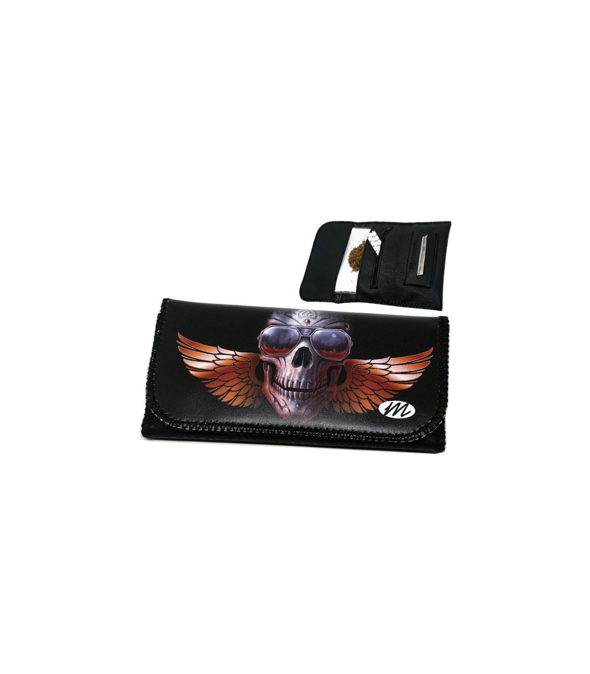 Η καπνοθήκη MONTE 0222 WINGS SKULL έχει μεγάλο μέγεθος, διπλώνει στα τρία και είναι κατασκευασμένη από τεχνόδερμα PU (Leather). Μπορεί να δεχτεί σακουλάκι καπνού μέχρι 30gr ή χύμα καπνό και διαθέτει θέσεις για χαρτάκια φιλτράκια. Κλείνει με τέσσερις εσωτερικούς μαγνήτες.