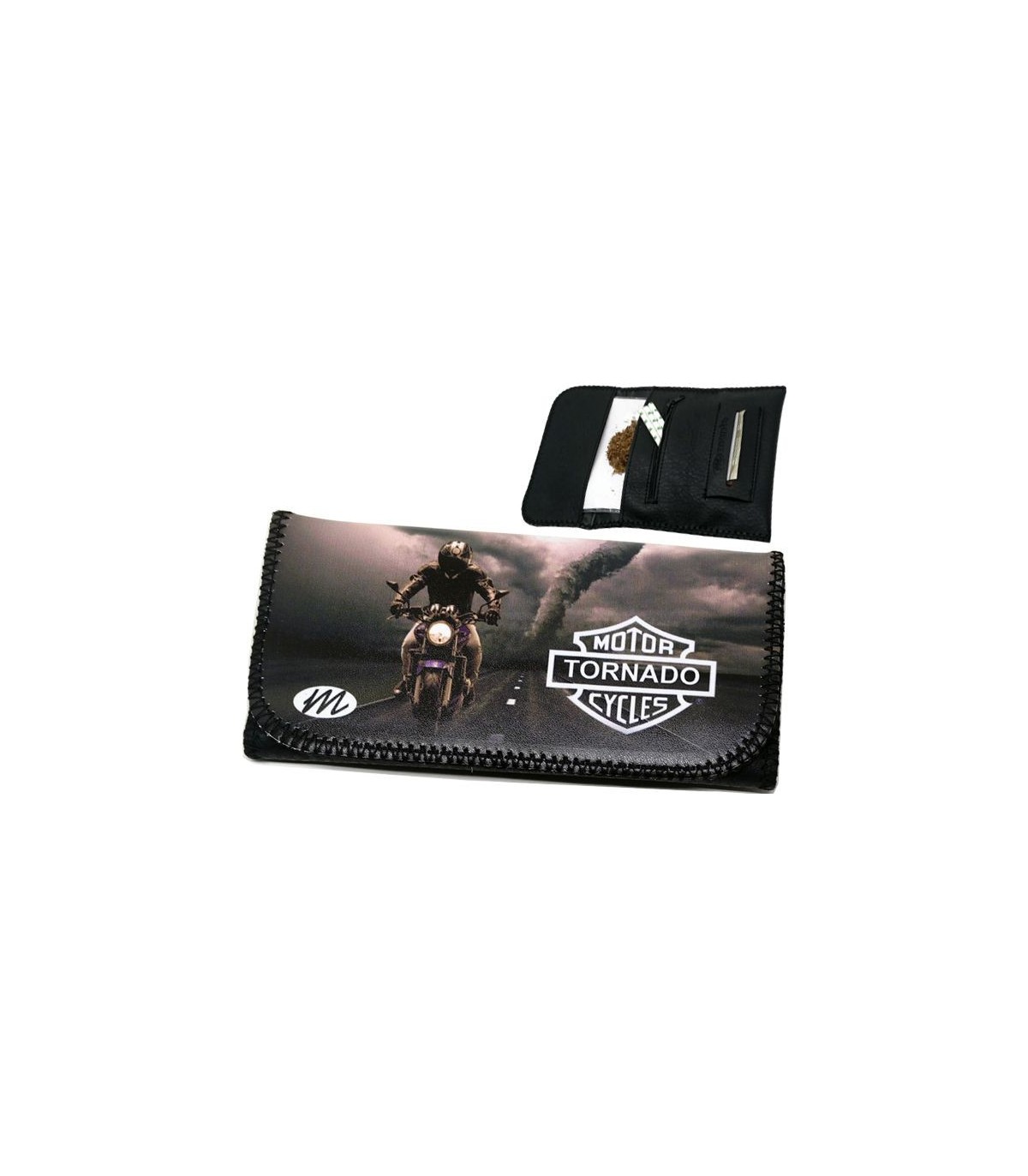 Η καπνοθήκη MONTE 0226 HARLEY TORNADO έχει μεγάλο μέγεθος, διπλώνει στα τρία και είναι κατασκευασμένη από τεχνόδερμα PU (Leather). Μπορεί να δεχτεί σακουλάκι καπνού μέχρι 30gr ή χύμα καπνό και διαθέτει θέσεις για χαρτάκια φιλτράκια. Κλείνει με τέσσερις εσωτερικούς μαγνήτες.