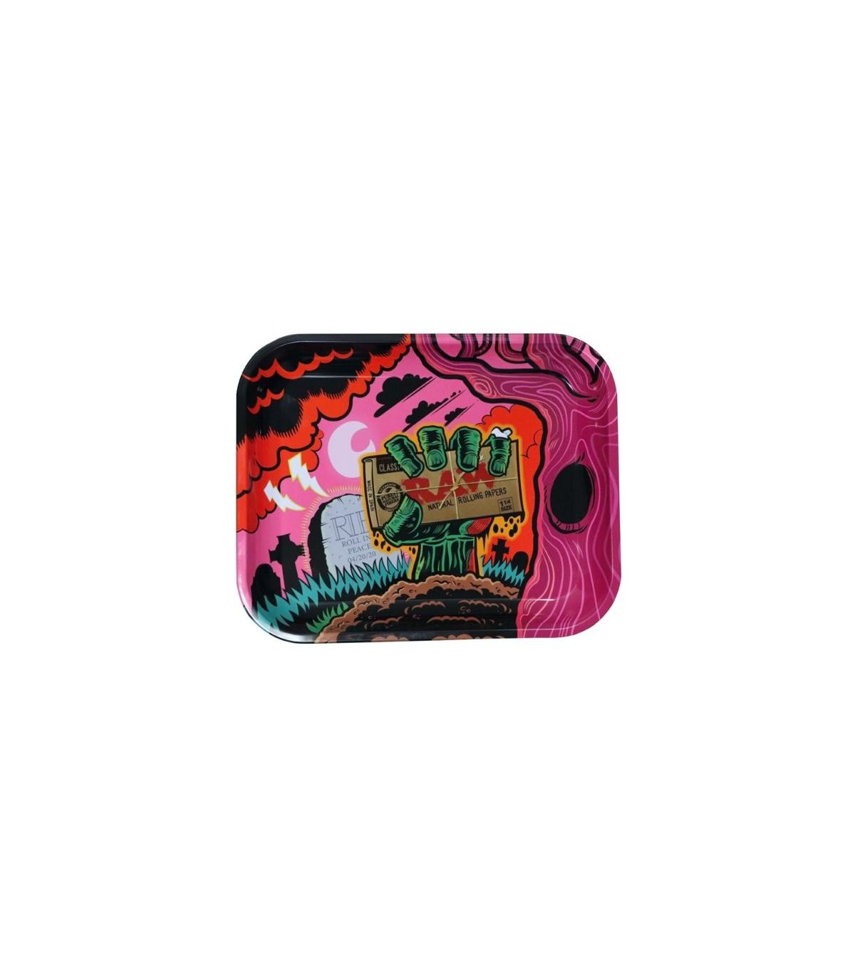 Δίσκος για στρίψιμο τσιγάρων RAW ZOMBIE METALROLLING TRAY MEDIUM. Είναι χρηστικός και συμβάλλει στο αποτελεσματικό στρίψιμο τσιγάρου. Διαθέτει τέλεια αντικολλητική λεία επιφάνεια κύλισης. θα διακοσμήσει ευχάριστα και τον χώρο σας, απλά θα τον λατρέψετε!