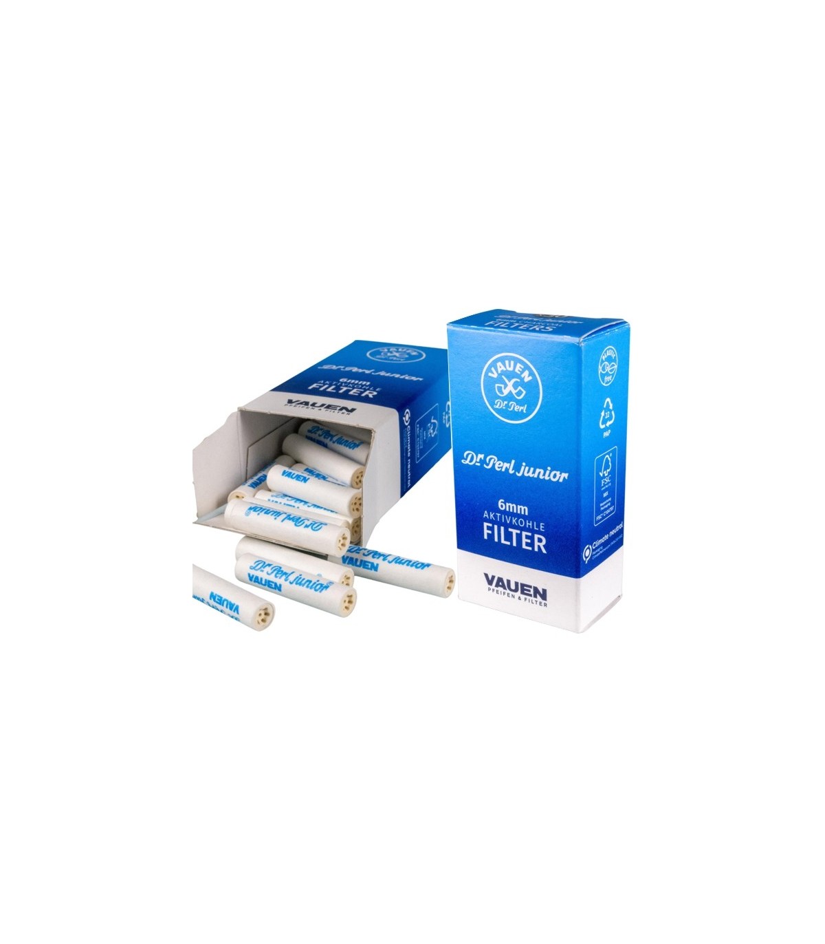 Τα φίλτρα πίπας καπνού ενεργού άνθρακα Vauen Dr Perl Junior Filters 6mm Ενεργού Άνθρακα Extra Slim, περιέχουν 30 φίλτρα και διαθέτουν 2 κεραμικά καπάκια. Ο ενεργός άνθρακας που περιέχει κατασκευάζεται στη Γερμανία, όπως άλλωστε και όλο το φίλτρο. Το συνολικό μήκος πίπας είναι 27mm.