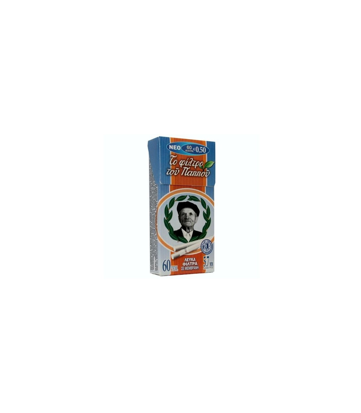 Το φίλτρο του παππού 47624 έχει 5,7mm διάμετρο και περιέχει 60 αεριζόμενα λευκά φίλτρα σε μεμβράνη. Είναι συσκευασμένα σε μικρή διακριτική συσκευασία, είναι ιδανικό για τον καπνιστή που στρίβει λεπτά extra slim στριφτά τσιγάρα και δεν θέλει να κουβαλάει μεγάλο πακέτο με φιλτράκια. Με λίγα λόγια ακόμη μια πρακτική συσκευασία με φιλτράκια του παππού που απευθύνεται σε καπνιστές για 5,7 mm διάμετρο στριφτό τσιγάρο.