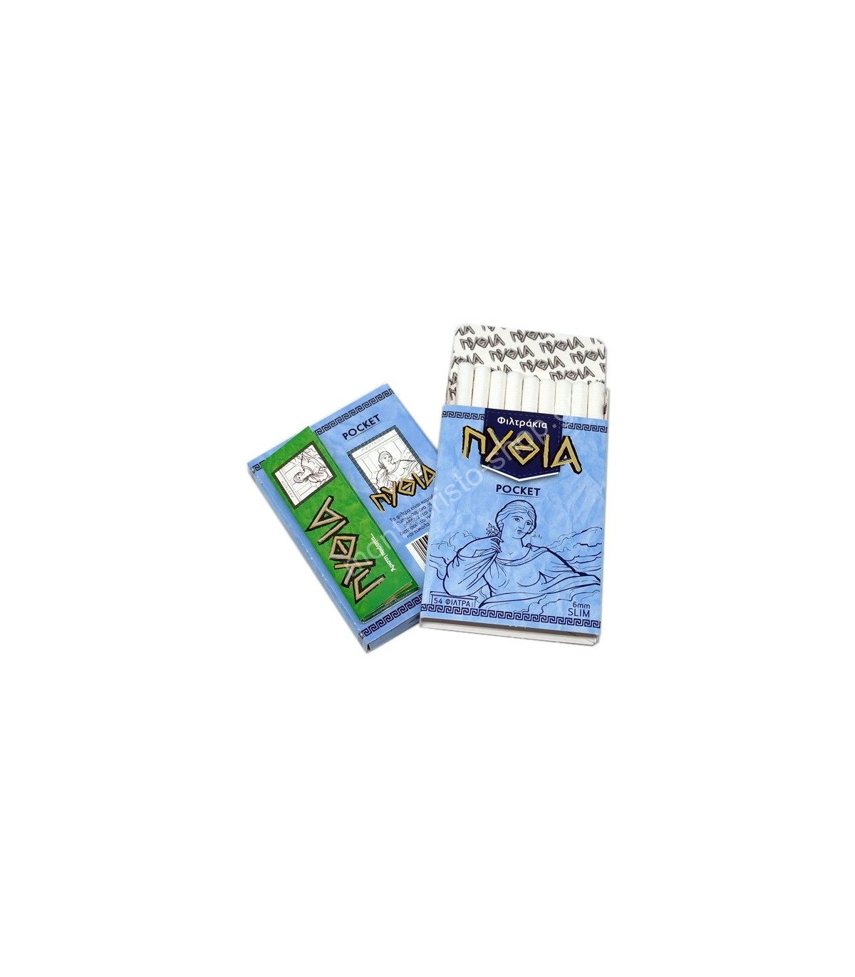 Τα φιλτράκια Πυθία POCKET SLIM 6mm 54 περιέχονται σε βολική συσκευασία με 54 φιλτράκια. Στο πίσω μέρος είναι κολλημένο ένα πακετάκι Χαρτάκια στριφτού Πυθία πράσινο 60.