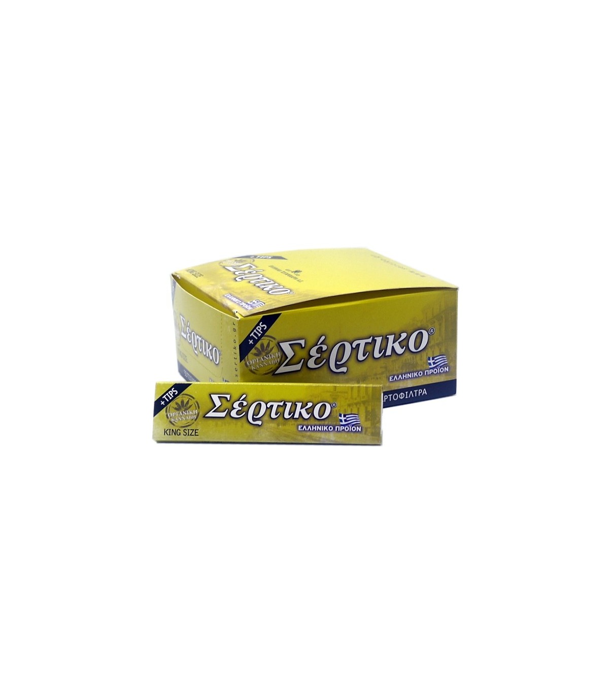 Τα χαρτάκια στριφτού Σέρτικο Οργανική Κάνναβη King Size +Tips είναι μεγάλα σε μέγεθος και περιέχουν 33 φύλλα & 33 τζιβάνες. Τα χαρτάκια Σέρτικο είναι κατασκευασμένα από χαρτί που φτιάχνεται από καλλιέργεια βιολογικής κάνναβης. Το πάχος τους είναι λεπτό και ανήκουν στην κατηγορία των βραδύκαυστων τσιγαρόχαρτων.