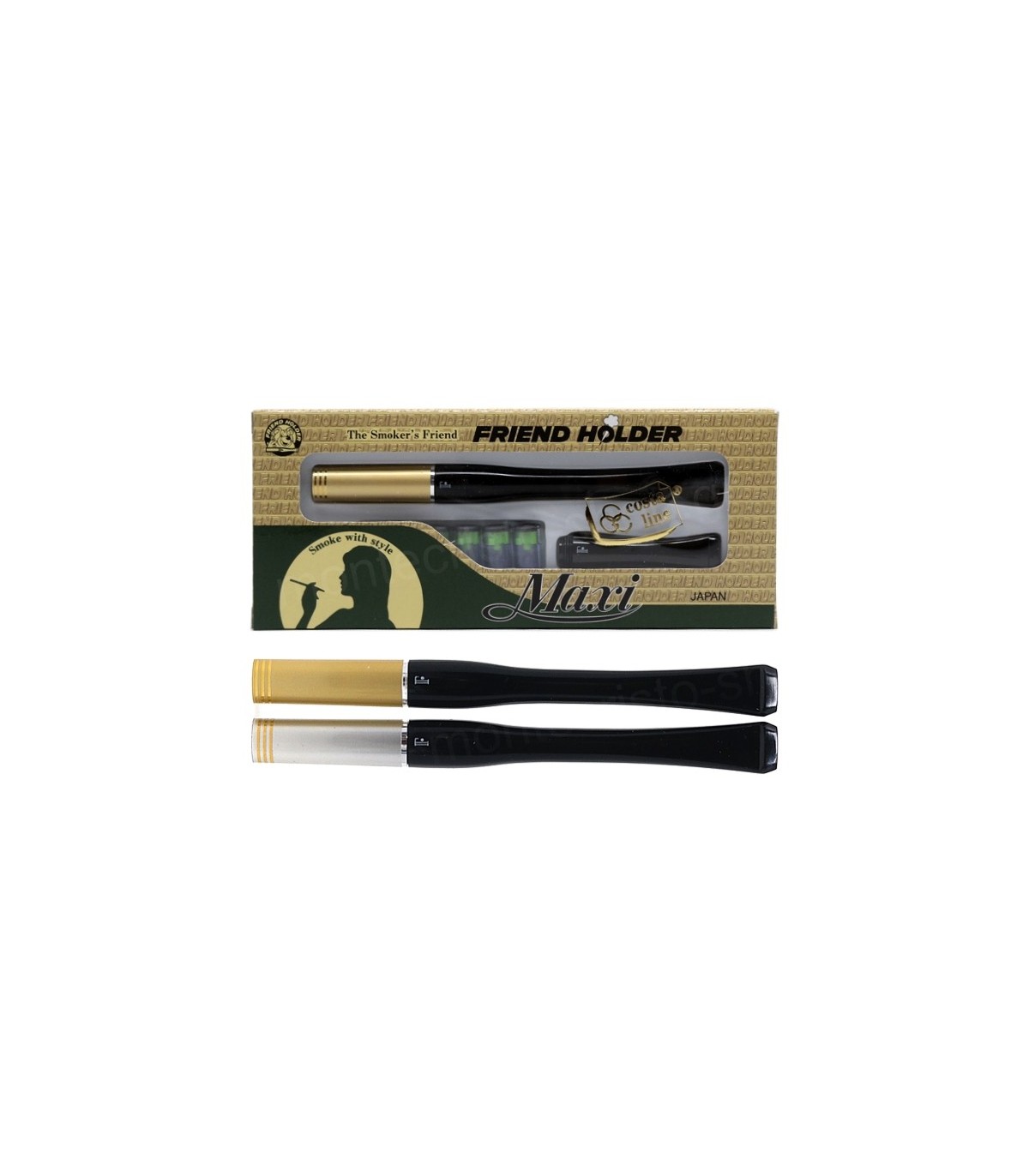 Την μακρυά πίπα τσιγάρου FRIEND HOLDER MAXI 3L MA μπορείτε να επιλέξετε σε χρώμα χρυσό ή ασημί, έχει μήκος 11.5cm και απευθύνεται σε καπνιστές που χρησιμοποιούν κανονικό τσιγάρο ή στριφτό 8mm. Έχει τέλειο φινίρισμα με τρεις ομόκεντρους επίχρυσους κύκλους στο τελείωμα. Εναλλακτικά μπορείτε να την χρησιμοποιήσετε και σαν κανονικού μεγέθους πίπα. Μπορεί και φιλτράρει αποτελεσματικά παράγωγα καύσης όπως η πίσσα και η νικοτίνη. Είναι συμβατή με τα ανταλλακτικά Friend Holder.