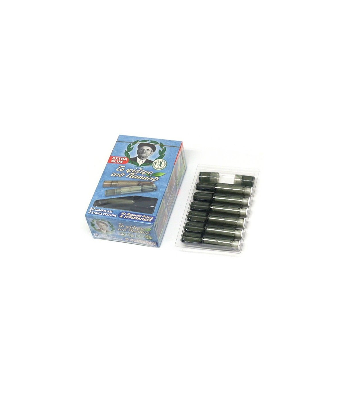 Τα πιπάκια του παππού 42902-078 EXTRA SLIM δέχονται τσιγάρα με 5.5mm / 5.7mm διάμετρο με μηχανικό φίλτρο και υγροαπαγίδες, αποσπώμενο στόμιο και περιέχουν 20 πίπες και 2 στόμια τα οποία και βιδώνουμε στα πιπάκια.