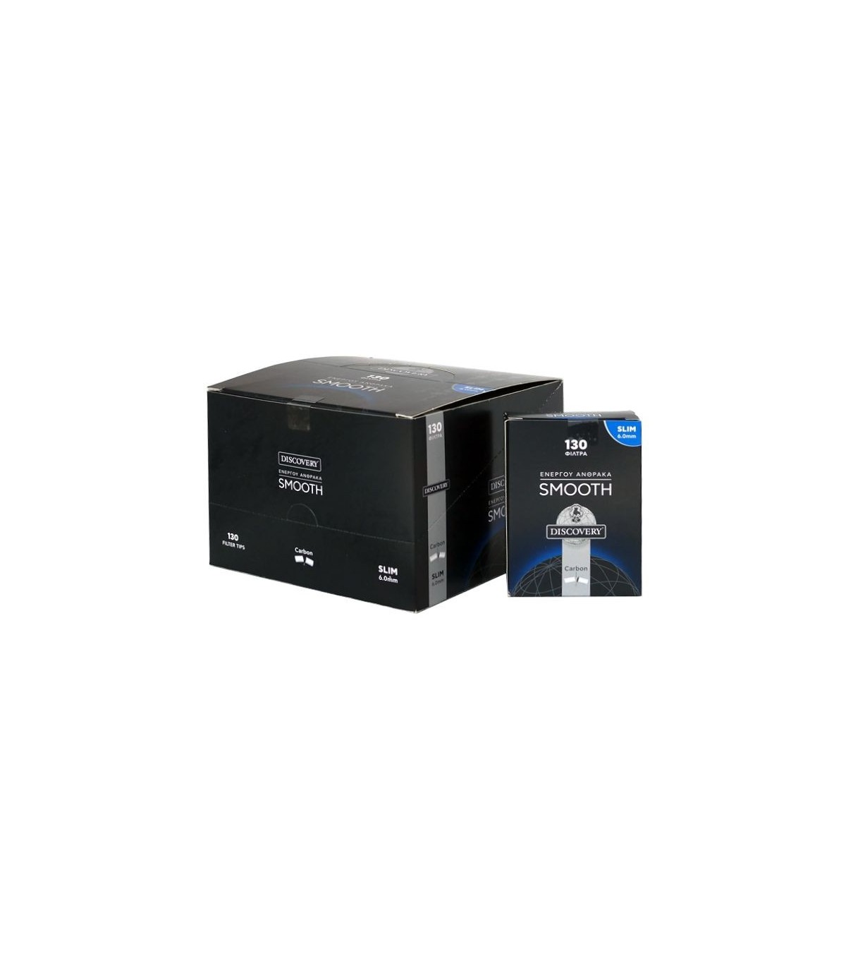 Τα φιλτράκια DISCOVERY SMOOTH CARBON ενεργού άνθρακα 6mm silm περιέχουν 130 φίλτρα (χύμα) και μπορούν να φιλτράρουν με τον αποτελεσματικότερο τρόπο τον καπνό του στριφτού σας τσιγάρου