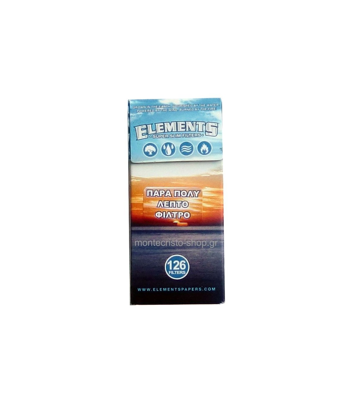 Τα φιλτράκια ELEMENTS SUPER SLIM διαθέτουν 126 φίλτρα σε σελοφάν και έχουν το πιο λεπτό πάχος με 5.3mm. Τα συγκεκριμένα φιλτράκια προτιμούνται από καπνιστές που θέλουν ένα λεπτό και λιτό στριφτό τσιγάρο με αποτελεσματικό και ποιοτικό φιλτράρισμα.