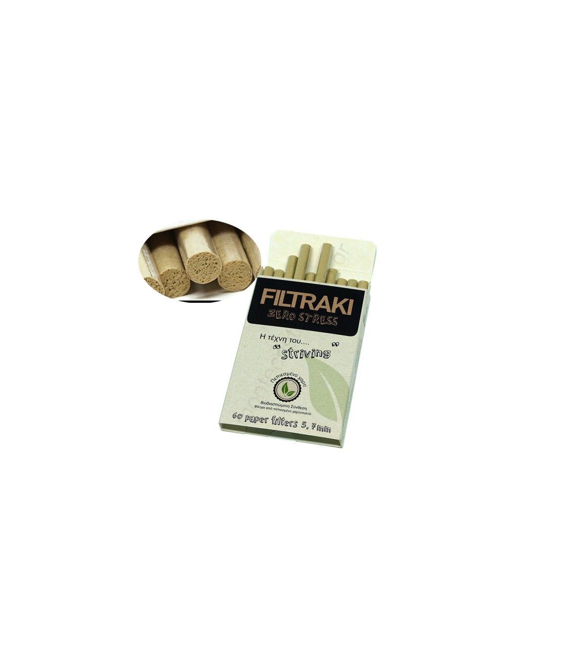 Το FILTRAKI ZERO STRESS 6.1mm SLIM περιέχει 60 φίλτρα από πεπιεσμένο χαρτί. Μπορείτε να χρησιμοποιήσετε πάνω από ένα φιλτράκι, σε king size τσιγάρο (σαν τζιβάνα).