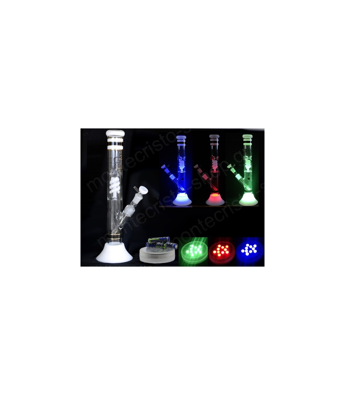Το Led φωτορυθμικό σύστημα εναλλάσσει πράσινο, μπλε και κόκκινο φωτισμό ανά λίγα δευτερόλεπτα σε όλο το bong δημιουργώντας ένα μαγευτικό αποτέλεσμα. Μπορείτε να ρυθμίσετε την εναλλαγή χρωμάτων με το ειδικό τηλεκοντρόλ που υπάρχει στη συσκευασία. Σας προτείνουμε να σβήσετε τα φώτα όταν ανάψετε το Led. Λειτουργεί με 3 μπαταρίες 3Α.