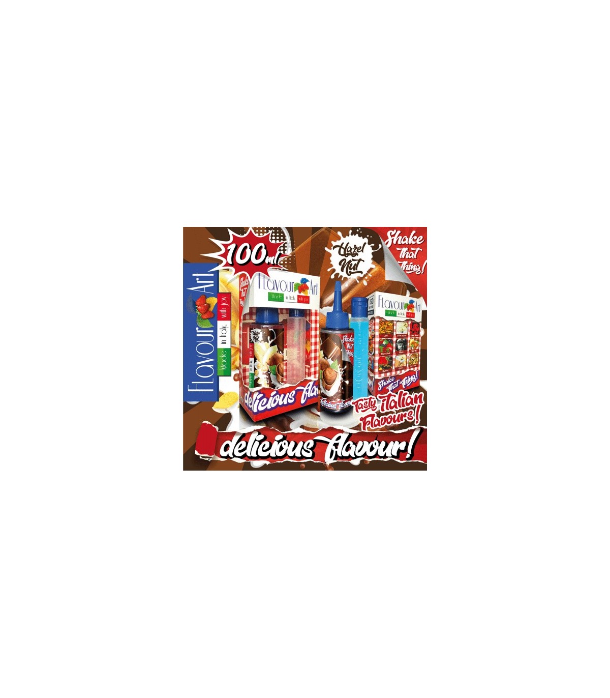 Τα Mix and Shake FLAVOURART 100ml έχουν τις ίδιες μοναδικές γεύσεις και αρώματα με τα μπουκαλάκια των 10ml, με την διαφορά ότι είναι πιο φθηνά και με περισσότερη ποσότητα. Στην συσκευασία θα παραλάβετε ένα μεγάλο μπουκάλι Mix Shake Vape FLAVOURART 115ml με περιεχόμενο 60ml άρωμα και ένα μικρότερο 40ml με φυτική γλυκερίνη (χωρίς νικοτίνη). Το μόνο που έχετε να κάνετε είναι να επιλέξετε την επιθυμητή νικοτίνη, να αδειάσετε τα boosters μέσα στο μεγάλο μπουκάλι FLAVOURART και στο τέλος να συμπληρώσετε μηδενική γλυκερίνη. Μην ξεχνάτε ότι πρέπει να γεμίσετε μέχρι σχεδόν πάνω (100ml), είτε με νικοτινούχα boosters, είτε με μηδενική γλυκερίνη. Έτσι, με απλό τρόπο, έχετε έτοιμο το αγαπημένο σας υγρό με νικοτίνη 0mg, 2mg, 4mg και 8 mg.